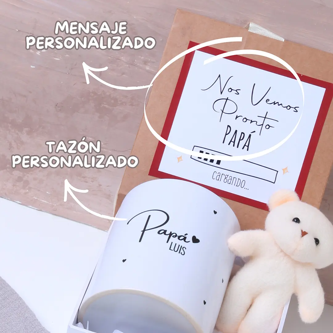 Caja rígida premium con mensaje en la tapa. El mensaje de la caja y de la taza lo puedes personalizar para tíos, papa, hermanos, entre otros.