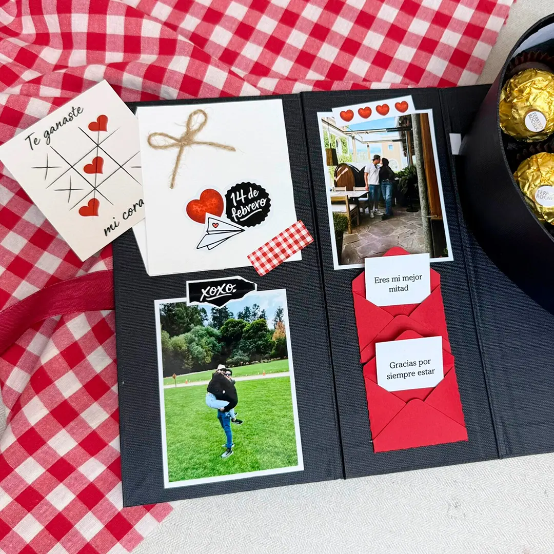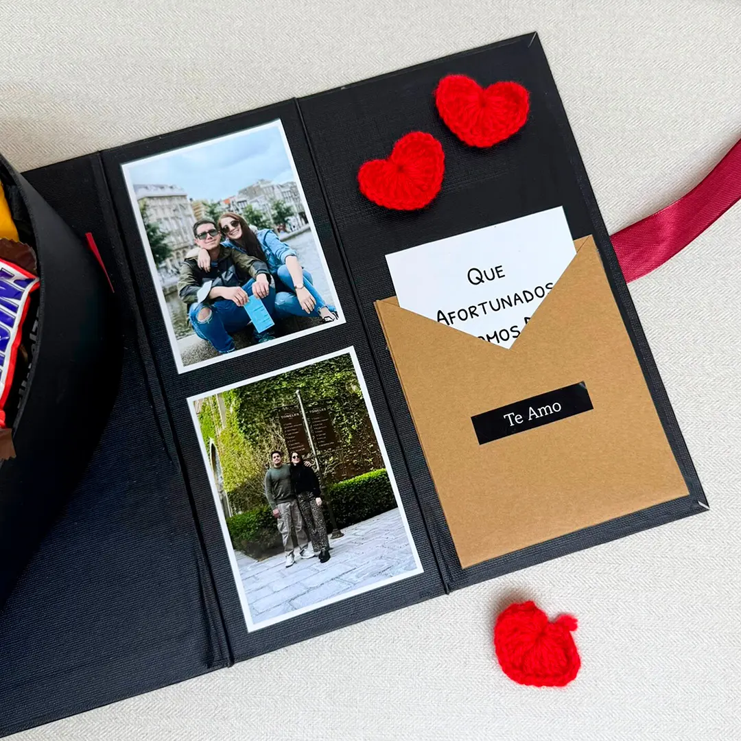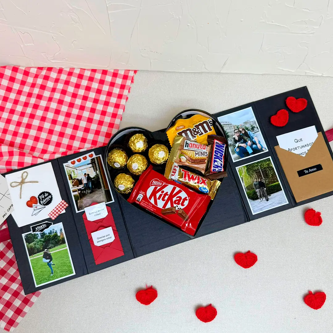 Caja desplegable con fotografías personalizadas, mensajes llenos de cariño y una selección de chocolates muy ricos.
