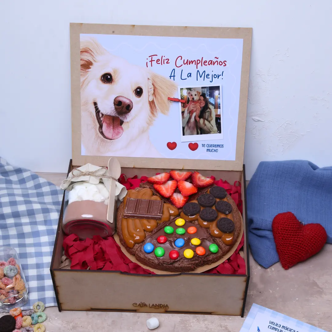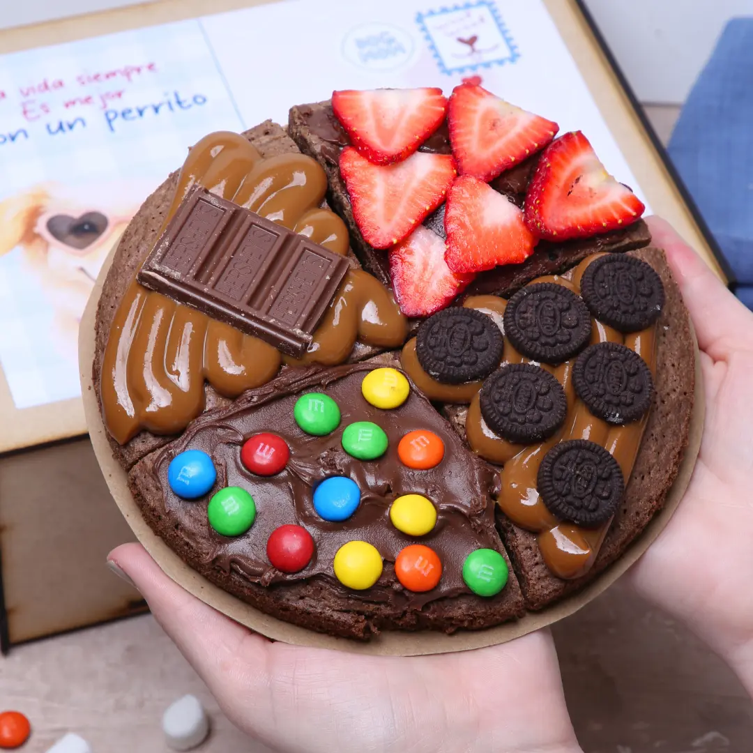 – Brownie artesanal húmedo con toppings de nutella, manjar, chocolate m&m, oreos, frutilla, chocolate Hershey´s